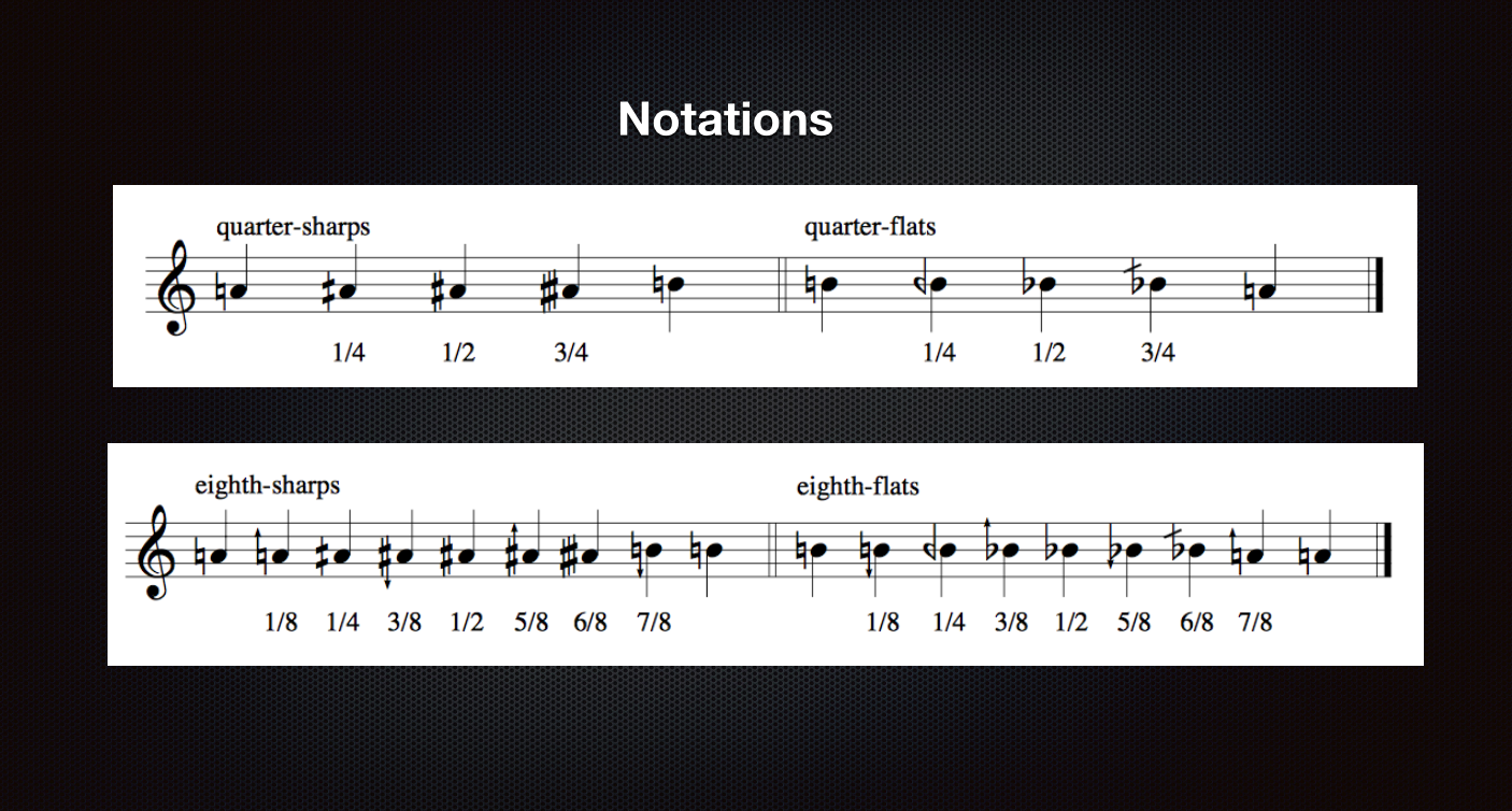 The above extract from Study 1 demonstrates the modest start of the studies. If you compare this to learning a piece in standard 12-div it raises a number of questions both for the composer and the player. The first is how to notate the quarter-tones. There are precedents of course, plenty, but little consensus. The signs we chose are ones which are available in music engraving software programmes and quarter-tone signs which allow further modification to become eighth-tone signs. We explicitly chose not to have ‘double signs’ (two signs together, one acting as modifier).