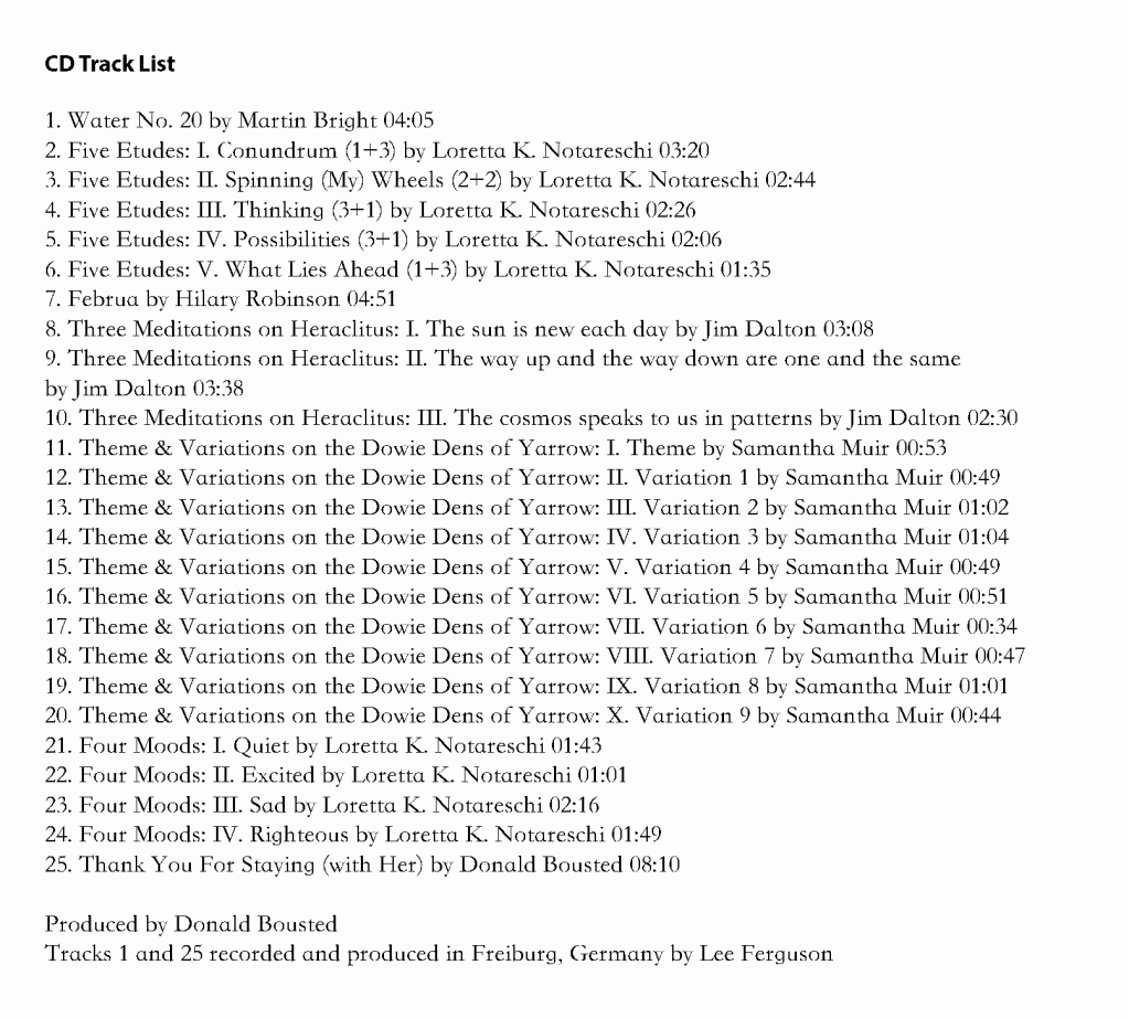 A year later I discovered the recent publication of Loretta K Notareschi’s ‘Five Etudes’ and purchased them immediately. I was blown away. I loved the fact that she had taken this instrument, not losing sight of its beautiful beginnings, into a completely different dimension; musically, spiritually and intellectually. At this point the connection was made between my ‘professional’ life in the world of new music (as a composer, producer and festival director), and the uke. Around this time I also discovered the fantastic performances of Samantha Muir on You Tube and I enjoyed reading about her own creative uke journey through research, arrangement and composition. So it gives me enormous pleasure to include not only Loretta’s Five Etudes on my first uke CD (and also a much more recent piece, her Four Moods), but also my interpretation of Samantha’s ‘Theme and Variations on The Dowie Dens of Yarrow’, one of a number of substantial compositions she has created for the uke. It was also wonderfully generous of Tony Mizen to agree to write an introduction to the CD: Tony, who, as I had found out through a number of email exchanges, is interested in many things and is, as it turns out, as interested in new music as well as arranging.