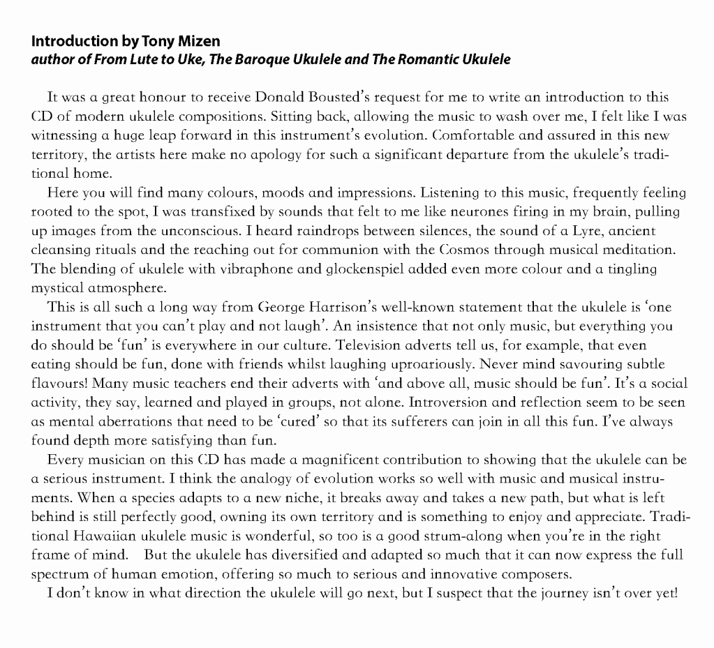 The playing on this CD is sublime: Donald extracts a beautiful tone from his ukulele, and his changes in tone are subtle and compelling. To get these wonderful composers on board was a fantastic achievement by Donald and when you mix this with Donald’s virtuosi playing, the whole album is a delight. Paul Mansell